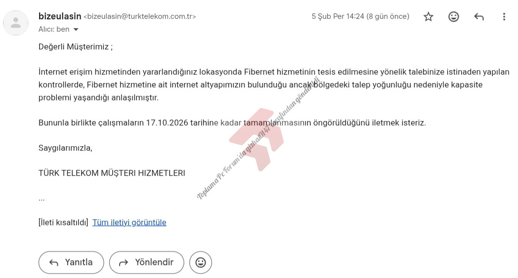 Selamun aleyküm beyler, fiber getirmeye çalışıyorum. Mail adresime böyle bir mail attılar, 17.10.2026 tarihinde fiber altyapının geleceğini söylediler. Yardımcı olabilir misiniz size zahmet?